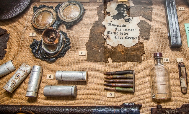 Среди экспонатов - бутылки с "коктейлем Молотова", гранаты, пулеметные ленты, личные вещи солдат. Кроме того, можно увидеть агитационные листовки германского вермахта.